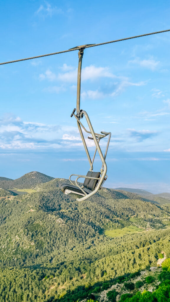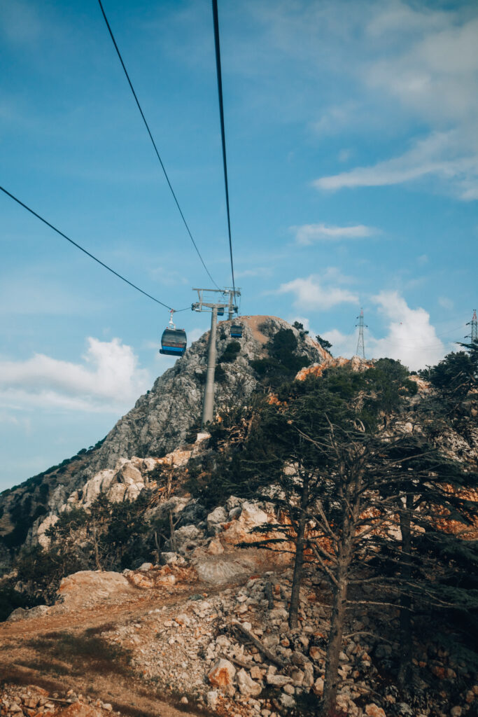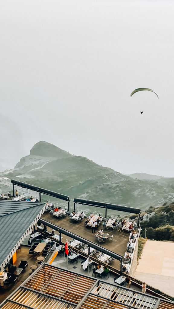 If you decide to go paragliding, a bus will take you up the mountain, where you can enjoy the stunning view. However, if you’re not into flying, you can still experience the beauty of Babadağ by taking a cable car to an elevation of 1700m. From there, you can go even higher using a chairlift. The ride is truly enjoyable. A round-trip ticket costs around €12 per person. There are three stations, and at each station, you’ll find a cafe or restaurant, making it a great spot for catching the sunset or having dinner. Just remember that the cable car closes at 9 pm, so plan accordingly.